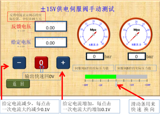 6、比例閥正常時(shí)的表現(xiàn)為:a、給定電流12.00ma時(shí),反饋電流在12.00ma,比例閥輸出的A、B腔壓力相同;b、用滑動(dòng)條可迅速換向,反饋電流改變且A、B腔壓力差較大;c、點(diǎn)擊增加按鈕,反饋電流逐漸增加且A、B腔壓力差逐漸增大;d、點(diǎn)擊減少按鈕,反饋電流逐漸減少且A、B腔壓力差逐漸減少,過(guò)12.00ma后比例閥會(huì)換向;